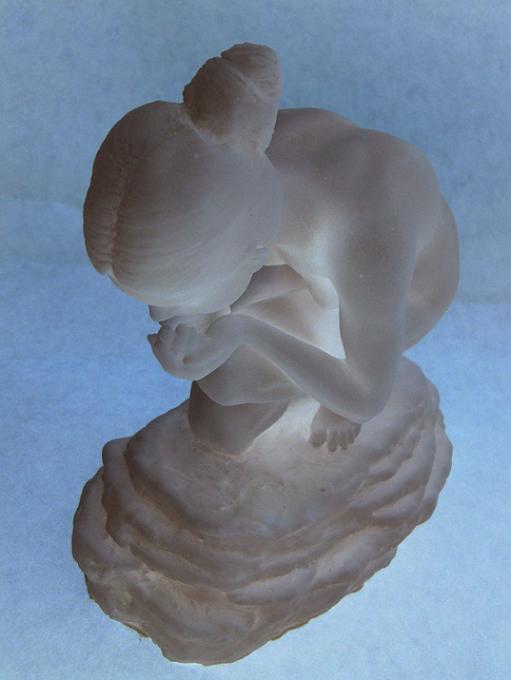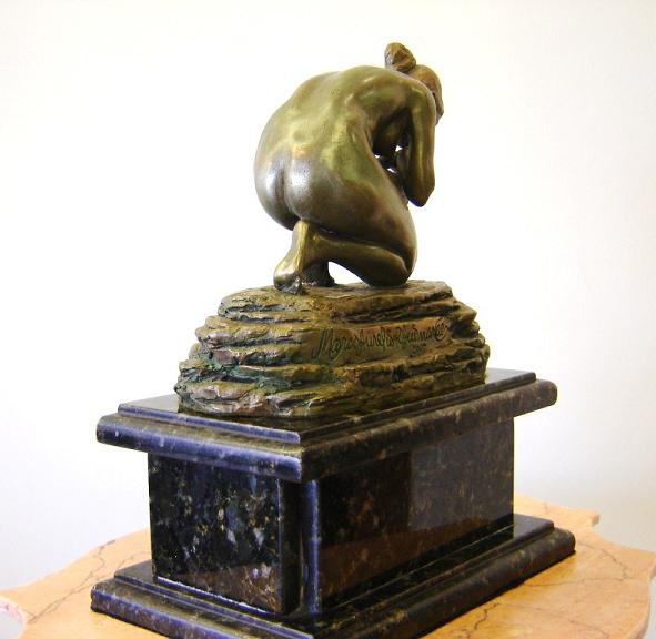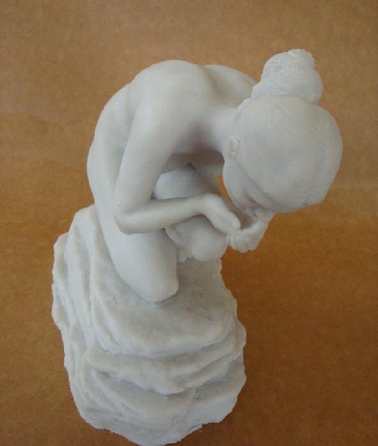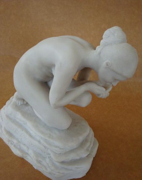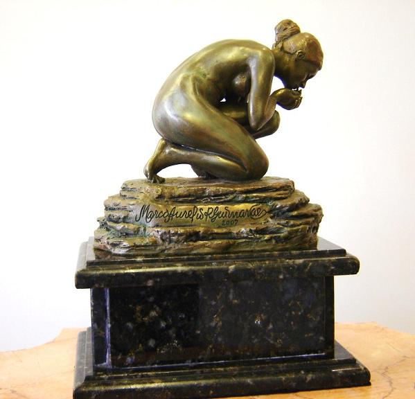 Reza uma antiga lenda, que em algum lugar distante e secreto havia uma fonte de águas puras e cristalinas, que quem dela bebesse ou nela se banhasse, jamais envelheceria. Esta pequena escultura procura representar fisicamente o espírito da lenda: - uma mulher que ao encontrar esta fonte, até então desconhecida, dela toma um pouco de sua água pura e a bebe para jamais envelhecer. Este trabalho foi bastante difícil de executar, uma vez que pretendi retratar uma figura feminina já adulta, não uma menina-moça, mas uma mulher formada, ainda sem o desgaste de uma idade um pouco mais madura, porém sem as indeléveis marca do tempo. Assim, suas massas corporais deveriam ser sutis, porém visíveis e anatomicamente dispostas em seu corpo. Por exemplo, as dobras que podem ser observadas em seu abdome não poderiam transparecer nem um excesso de peso e nem um sinal de flacidez. Por outro lado, as pequenas dimensões da peça exigiram uma maior acuidade no trabalho, já que um erro ou engano em algum pequeno detalhe, acarretaria uma deformação proporcionalmente maior que aquela que ocorreria em peças de maior porte. |