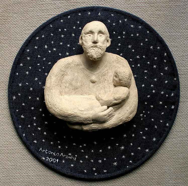 escultura em argila sobre bordado em jeans - 35 x 35