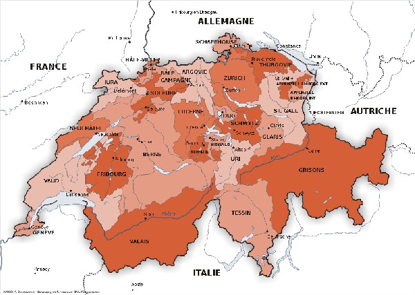 A Suíça, à semelhança de outros países federais, é constituída por 26 estados autônomos. Segundo a Constituição Federal, estes estados são designados "cantões" e são independentes e soberanos. Os cantões (oficialmente designados como membros da Federação Helvética) podem criar suas leis, de modo a que essas leis não interfiram nos outros cantões. Cada cantão tem Constituição própria, as suas regras, estatutos, etc. Todos os cantões têm parlamento independente, o que reforça a sua autonomia, com diferenças não somente territoriais, populacionais e econômicas, mas de tradições e costumes.Abaixo uma demonstração dos cantões suiços e seus brasões: