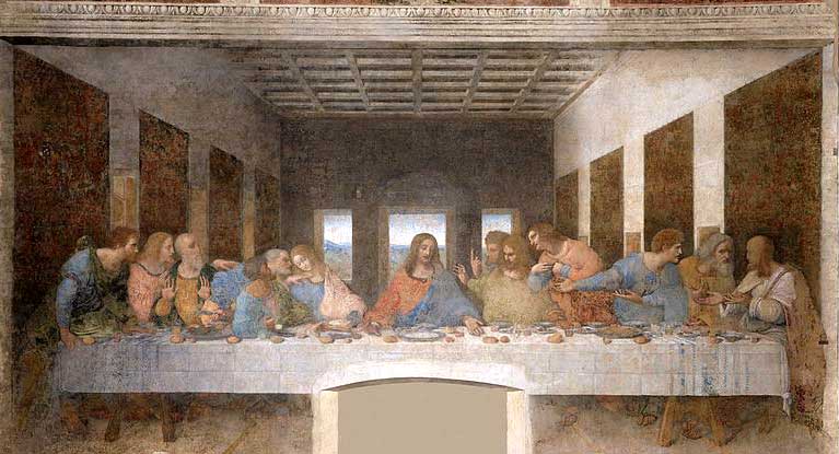 Nos evangelhos, a "Última Ceia" (também chamada de "Ceia do Senhor" ou "Ceia Mística") foi a última refeição compartilhada por Jesus com os doze apóstolos antes de Sua morte e ressurreição. Leonardo da Vinci (1452-1519) imortalizou esse encontro num afresco para o refeitório do convento de "Santa Maria delle Grazie", em Milão (1492-1519). Esse afresco sofreu agressões ao longo do tempo, desde a abertura de uma porta pelos padres até o bombardeio aéreo na Segunda Guerra Mundial. Ao centro, Cristo é representado com os braços abertos, num gesto de resignação tranquila, formando o eixo central da composição. São representadas as figuras dos discípulos num ambiente que, do ponto de vista de perspectiva, é exato. Os apóstolos se agrupam em quatro grupos de três, deixando Cristo relativamente isolado ao centro. Da esquerda para a direita (do ponto de vista de quem está diante da pintura), segundo as cabeças, estão no primeiro grupo: Bartolomeu, Tiago Menor e André; no segundo grupo Judas Iscariotes (cabelo branco inclinado contra o suposto João), Simão Pedro e João, este o único imberbe do grupo; Cristo ao centro; Tomé, Tiago Maior e Filipe (este também imberbe) e no quarto grupo estão Mateus (aparentemente com barba rala), Judas Tadeu, Simão Cananeu, também chamado de Simão, o Zelote, por último. Estas identificações provêm de um manuscrito de Leonardo da Vinci encontrado no século XIX.