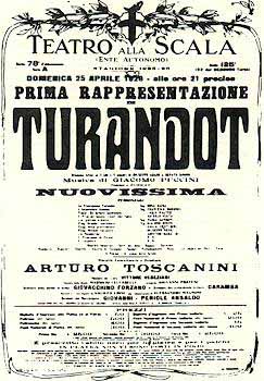 Última ópera de Giacomo Puccini, "Turandot" ficou inacabada devido à morte do compositor, ocorrida em Bruxelas a 29 de novembro de 1924, e foi completada por Franco Alfano. Estreou no Teatro Scala de Milão a 25 de Abril de 1926, sob a batuta de Arturo Toscanini - que, por não gostar do final composto por Franco Alfano, virou-se para a platéia ao final da cena da morte de Liù e disse: "Senhoras e Senhores, aqui parou Giacomo Puccini". Em 2001, o