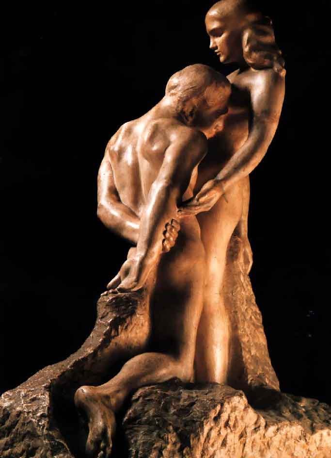 Auguste Rodin tornou-se um dos mais destacados escultores do século XIX, tendo o seu trabalho rompido com as fórmulas rigidas e 0 estilo da escultura acadêmica, introduzindo nessa Arte um sentido novo de energia, imaginação e criatividade. O objetivo primordial de Rodin era o corpo humano, que ele usava como um instrumento para exprimir emoção e movimento, e não apenas com o propósito de um estudo anatômico. Suas imagens apresentam grande força, delicadeza e erotismo, e "The Eternal Idol", em particular, destaca a plena realização de Rodin na sensualidade da forma humana. Há uma percepção de formas flexíveis e fluidas fundindo-se nessa sensualidade. Há, também, uma impressão de reverência pelo corpo feminino, quando a imagem masculina ajoelha-se beijando seu amor ternamente sobre o coração. As duas imagens em "The Eternal Idol " expressam absorção completa um no outro. Para Rodin essa intimidade era como um ato de adoração. Rodin esculpiu várias versões de "The Eternal Idol", em tamanhos e materiais diversos. Rodin disse: "O que é essencial é emocionar-se, amar, ter esperança, vibrar, viver. Ser um homem antes de ser um artista!"