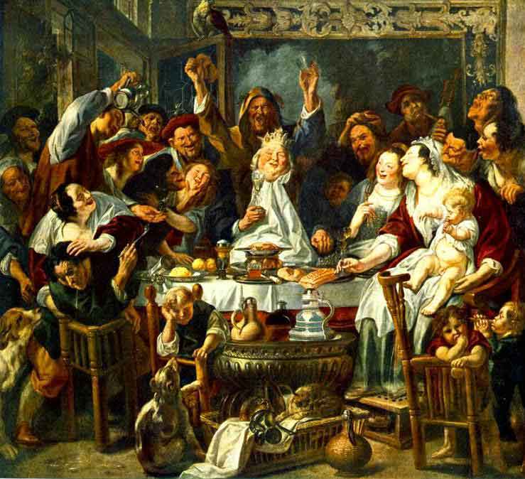 Jacob Jordaens, artista flamengo, nasceu em Antuérpia, em 1593, numa família de comerciantes de linho. Foi aluno de Adam van Noort (desde 1607), com quem Rubens estudou por algum tempo. Mais tarde, Jordaens casou com a filha de Noort, Catharina. Em 1615 ele se juntou à Corporação de São Lucas e, em 1621, tornou-se seu diácono. Jordaens pintou temas religiosos, mitológicos e históricos, retratos e cenas de gênero, além de grandes e monumentais decorações. A princípio, marcado pela influência de Caravaggio, prevalecem as cenas noturnas com iluminação a velas ou ao luar. A individualidade do jovem mestre foi revelada em composições gradiosas, onde várias imagens enchiam toda a superfície do quadro, mas onde faltava profundidade. Este método não mudou durante a vida do artista. Talvez fosse o resultado de seu trabalho em cortinas, que ele desenhava, pintava sobre linho e que eram vendidas por seu pai. Jordaens nunca visitou a Itália, nem tentou imitar o estilo italiano. Seu modo de ser leva-o para perto de Rubens, em cujo ateliê trabalhou várias vezes. Jordaens adotou o estilo de Rubens, mas não tinha a sua inexaurível fantasia. Mesmo os motivos religiosos e mitológicos são interpretados por ele como pintura de gênero, seus personagens são inspirados na natureza e tirados da vida cotidiana. Algumas vezes as pinturas de Jordaens parecem sobrecarregadas, com imagens volumosas, como em Allegory of Fertility. O talento de Jordaens se revelava em pinturas em que buscava assunto no folclore. em fábulas, provérbios e contos. Os museus de Moscou, Kassel, Budapeste, Munique e Bruxelas têm variações do quadro The Satyr and the Farmer's Family, tendo uma fábula como enredo. Em 1634, sob a supervisão de Rubens, Jordaens e vários outros pintores trabalharam numa grande encomenda de um magistrado de Antuérpia: as decorações para a visita do Príncipe Ferdinand à cidade. Depois da morte de Rubens, Jordaens tornou-se o líder da escola de Antuérpia, executando inumeráveis encomendas para a Igreja e a corte entre 1640 e 1650, inclusive 22 quadros para o salão da Raínha Henrietta Maria, em Greenwich, trabalhos para as cortes da Escandinávia e da França. Em 1650 o artista converteu-se ao Calvinismo, mas continuou a receber encomendas da Igreja Católica. Os pintores do seu ateliê cada vez adquirem maior importância, realizando trabalhos decorativos grandiosos e pomposos, e Jordaens gradualmente perde sua originalidade. O artista morreu em 1678 em Antuérpia. Jacob Jordaens foi um dos grandes pintores barrocos flamengos, junto com Rubens e van Dyck.